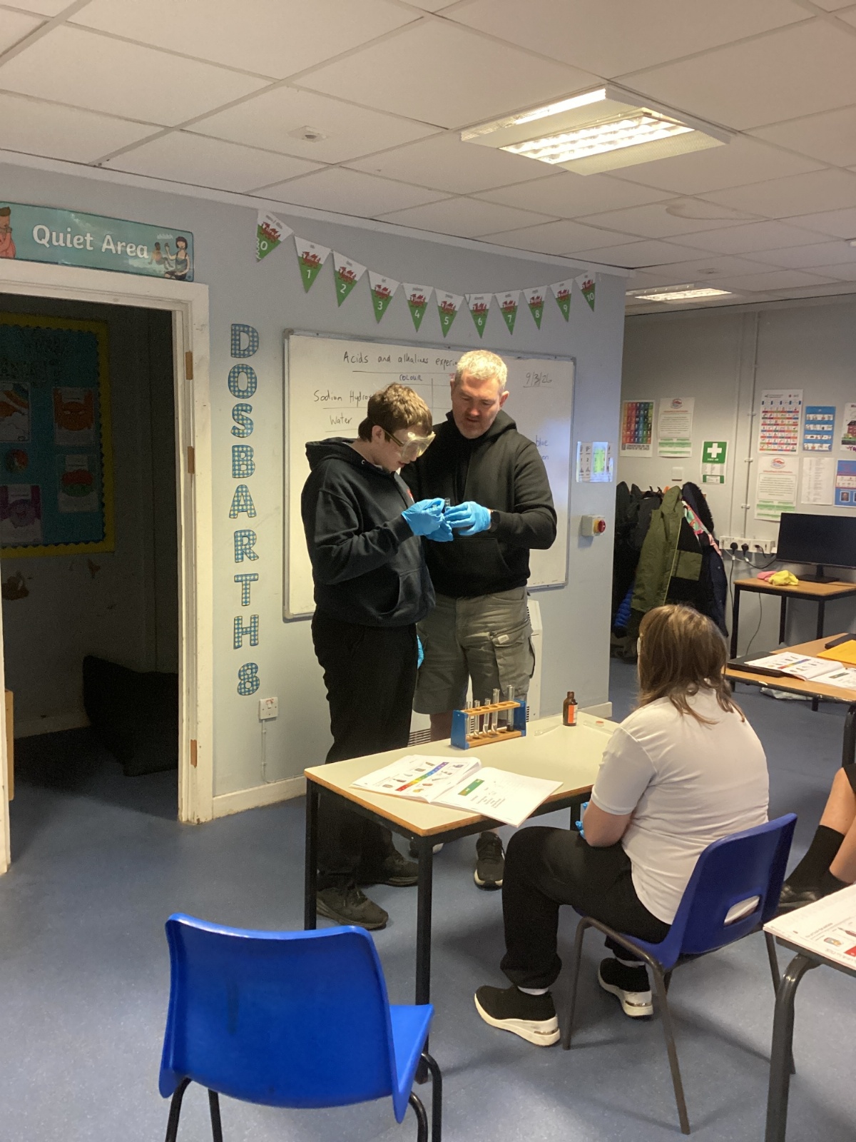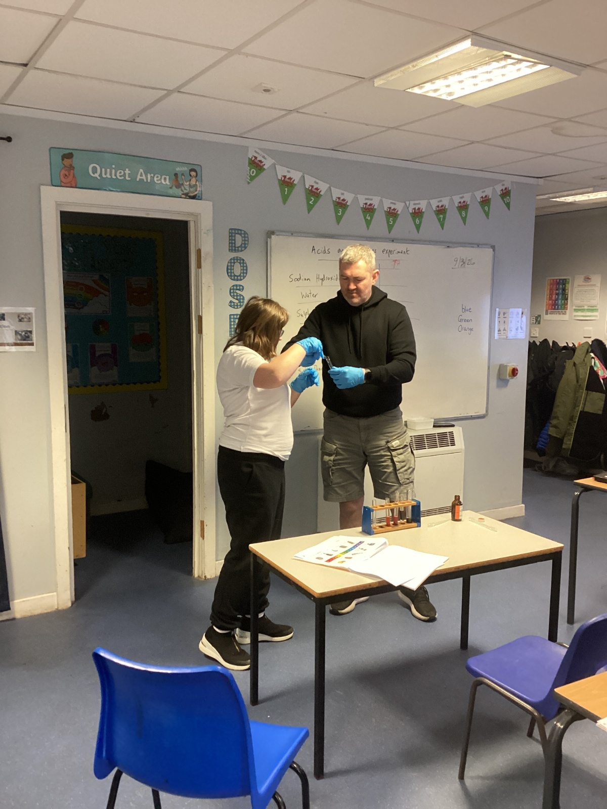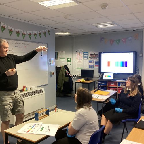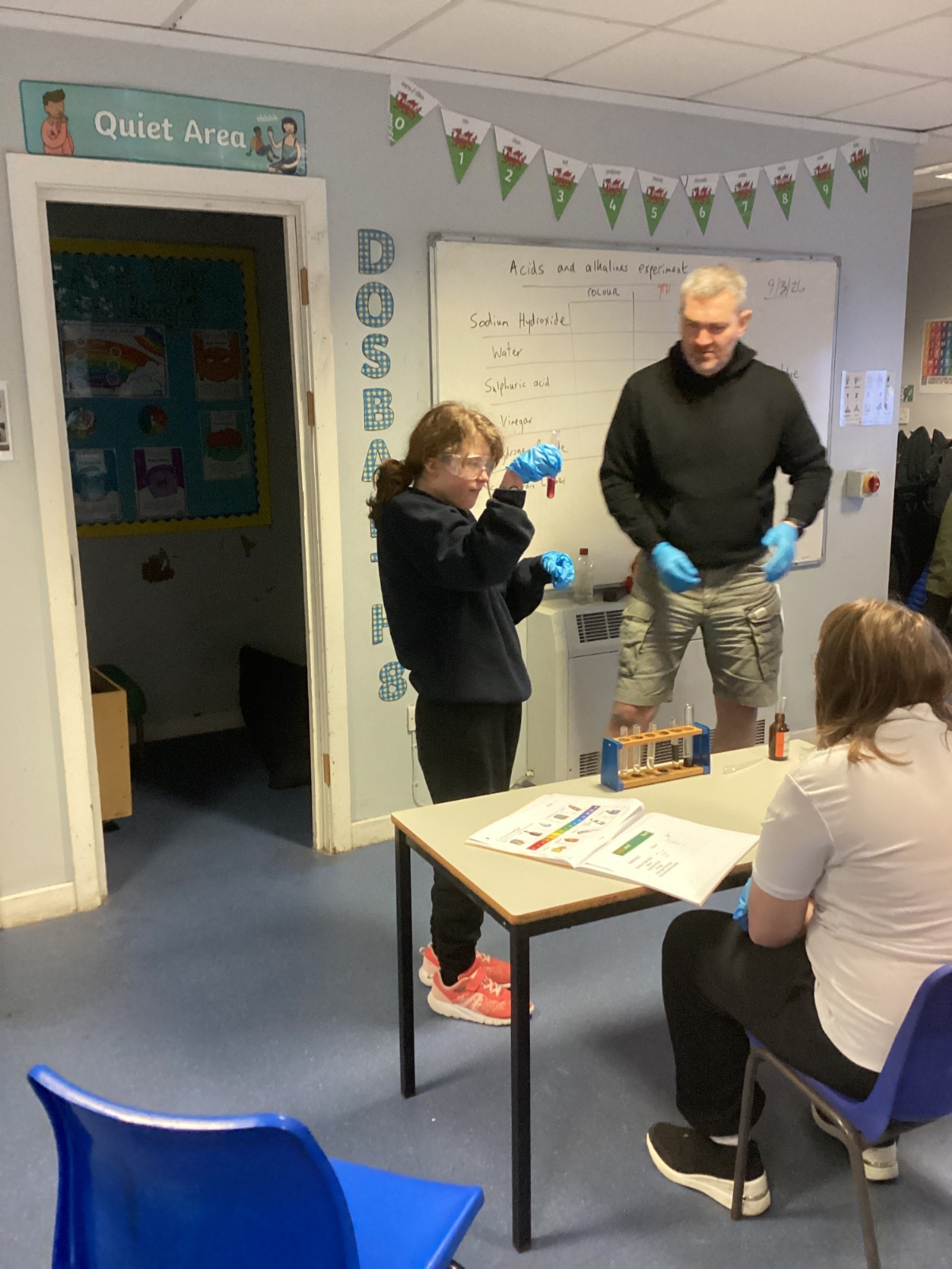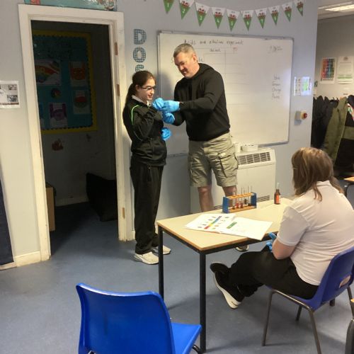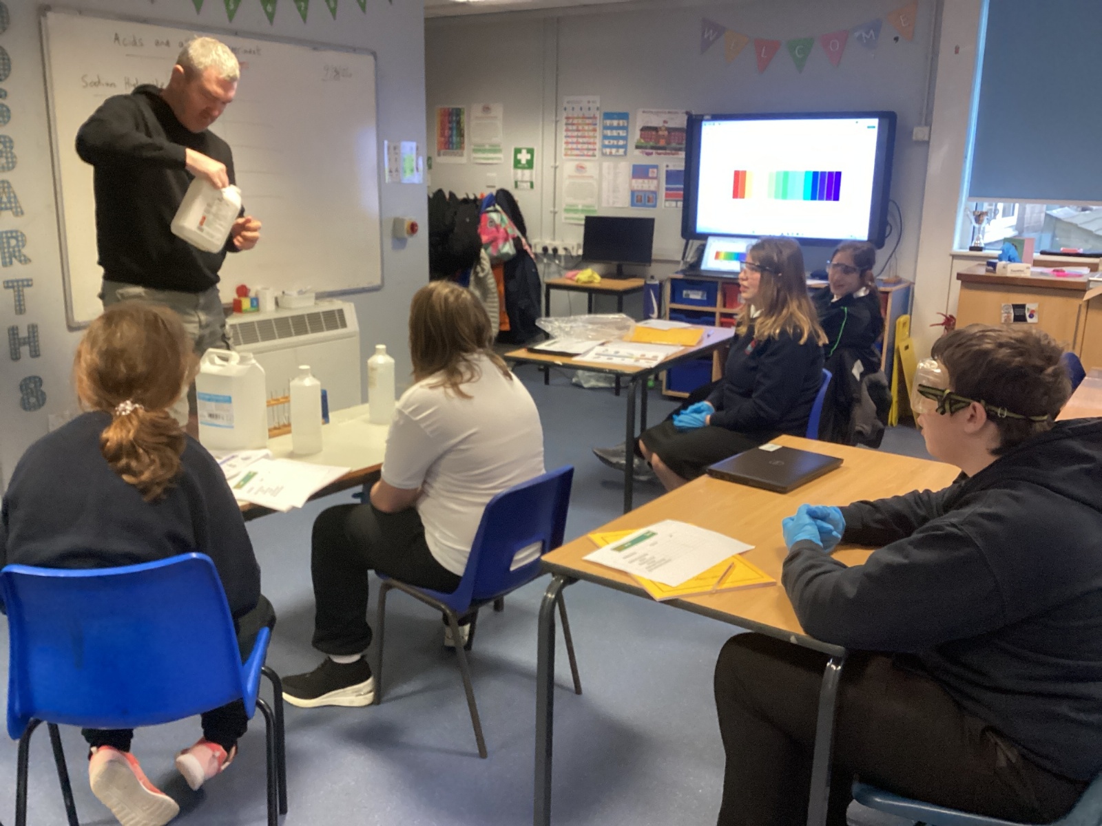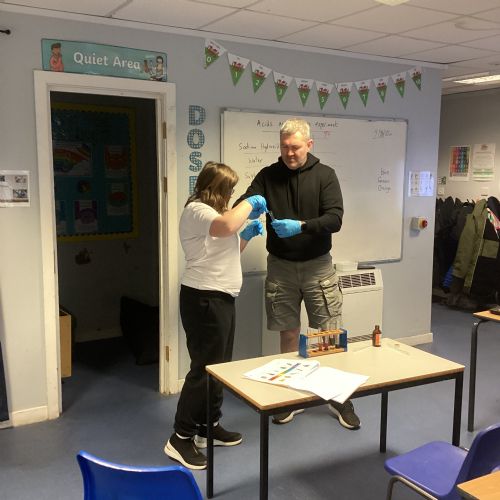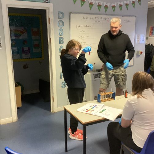 Pupils tested a variety of everyday substances such as vinegar, lemon juice, water and Sulphuric acid and bleach. Using universal indicator solution, they carefully observed colour changes and recorded the corresponding pH values.